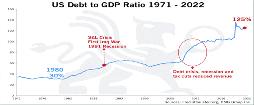 Risks to the economy and markets seem to be many of the same that have been in plain sight for many years. Debt-to-GDP levels have been rising for decades in the United States. Recently we just avoided a debt ceiling showdown and basically kicked the can down the road until 2025, when real cuts in federal spending may have to be made (or taxes must be raised). But this has happened before, last-minute deals will be struck and financial markets have overall marched higher. The chart below illustrates the substantial growth in national debt that we have witnessed over the past decades.